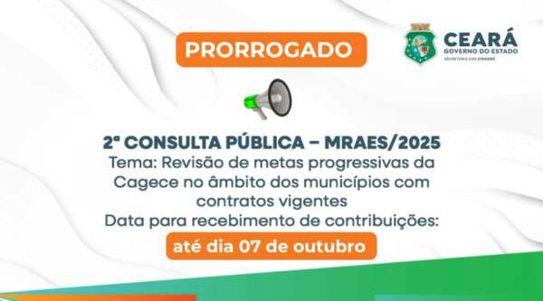 As Microrregiões de Água e Esgoto – MRAEs Oeste, Centro-Norte e Sul, por meio da Secretaria das Cidades do Estado do Ceará, informam que se encontram em Consulta Pública, propostas de metas progressivas que visam à universalização dos serviços de abastecimento de água e esgotamento sanitário no âmbito dos contratos regulares firmados entre Cagece e municípios.